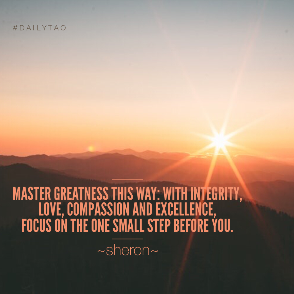 LIVING THE TAO: Today, determine if your thoughts are consumed with accomplishing something great. If it feels overwhelming then stop focusing on huge greatness, and instead just take the first small step, then the next, then the next. Accomplish greatness with joy in small steps.