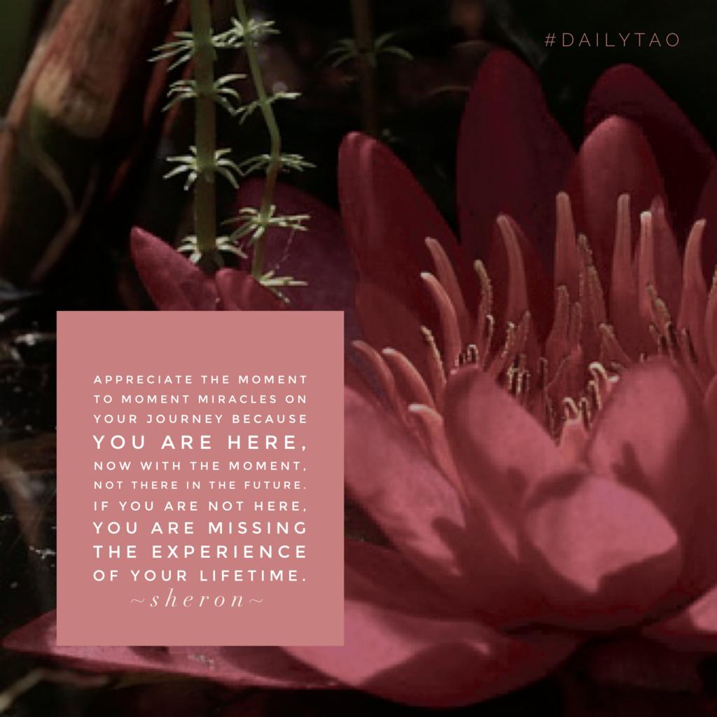 LIVING THE TAO: Where do you spend most of your time? Right here in this moment, or fixated on what will happen next? If you are not here, you are missing the experience of your lifetime. Start now by just focusing on the sound of your breath, or a piece of art for one minute and experience the miracle of your senses.